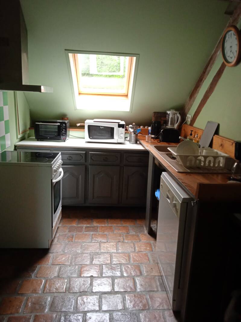 Le gîte se trouve à l'étage, il faut monter l'escalier en pierre, il a une superficie de 80m2 avec un grand séjour, une cuisine, une salle d'eau et une grande chambre avec 3 lits de 140 et 1 lit de 90.